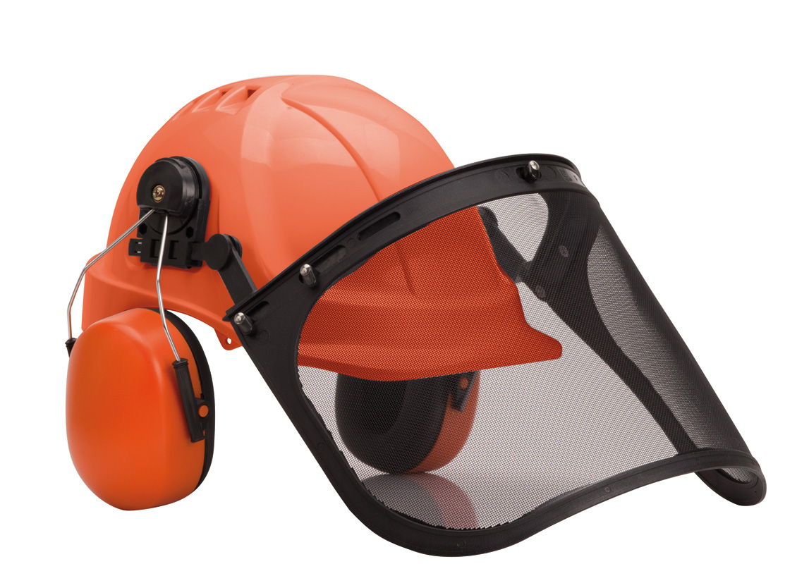 Bestehend aus einem hochwertigen, orangefarbigem Schutzhelm mit Belüftung und daran fest angebrachtem Gehörschutz sowie Gitter-Klappvisier nebst Kinnriemen. Kopfumfang mittels großem Drehknopf einstellbar