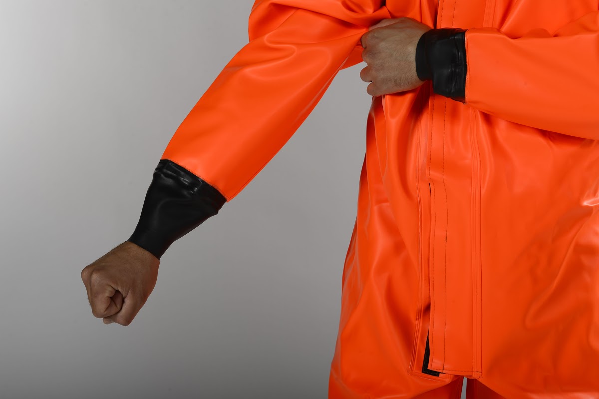 An den Ärmeln wahlweise Latexmanschetten oder PVC-Handschuhe. Je nach beabsichtigtem Einsatzzweck