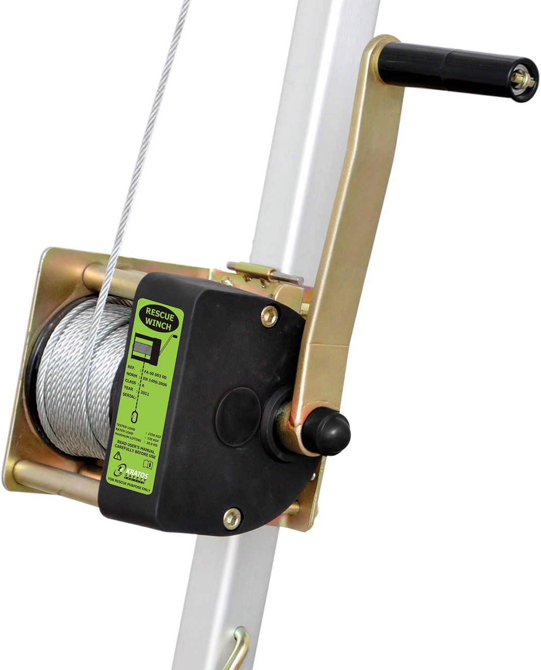Diese Winde kann am Alu-Dreibein montiert werden und ermöglicht das Ablassen oder Hochziehen von Lasten sowie das Retten einer bewustlosen oder verletzten Person aus dem Schacht. Das verzinkte Drahtseil hat eine Stärke von 4,8 mm und trägt beim Lastentransport bis zu 250 kg bzw beim Einsatz als Rettungswinde max. 135 kg.